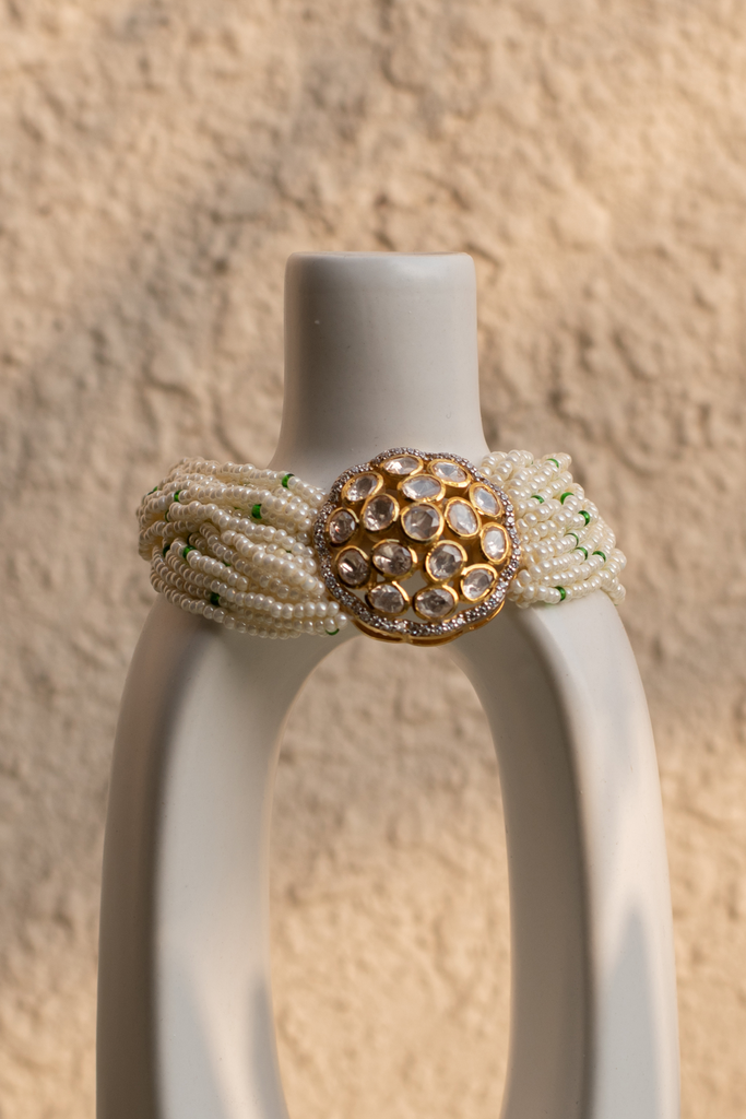This exquisite piece of jewelry, a blend of tradition and modernity, is adorned with delicate white pearl strings, meticulously arranged and interspersed with sparkling green gemstones. At its center lies a radiant circular moissanite polki brooch, a testament to skilled craftsmanship and intricate design. Ageless in its appeal, this ornament transcends generations; it can be gracefully worn by both mother and daughter alike. Its versatile elegance allows it to pair seamlessly with any attire, enhancing the wearer’s grace and adding a touch of sophistication.
