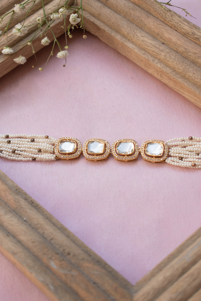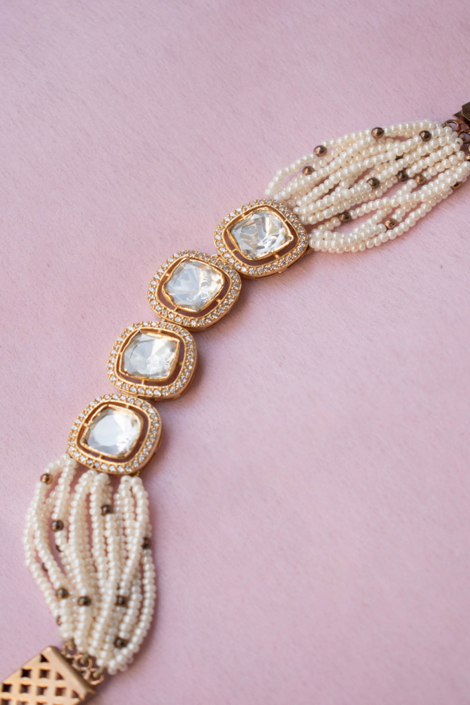 A captivating bracelet featuring a minimalist design adorned with shimmering moisssnite polki stones. Crafted in silver with gold plating, this exquisite piece offers a delicate and elegant style. The intricate detailing and sparkling gems make it a perfect accessory for any occasion.