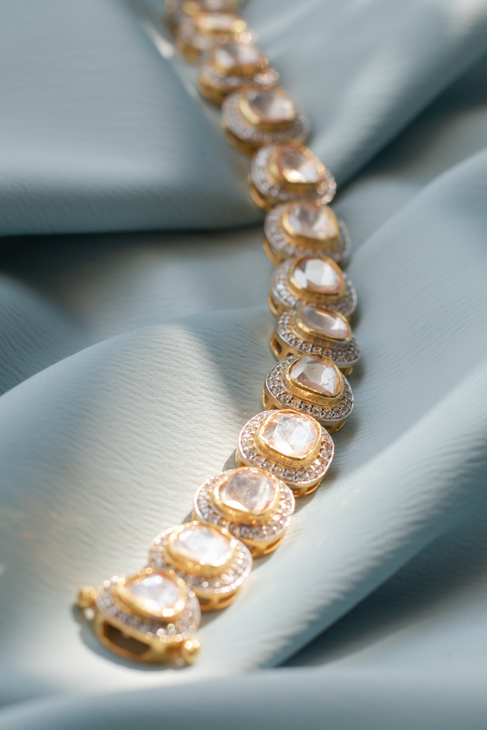 This exquisite bracelet, a blend of elegance and tradition, is crafted from 925 sterling silver with intricate gold plating. Each detail is meticulously woven to create a timeless heirloom accessory. Perfect for weddings, it adds a touch of grace to bridesmaids and brides alike, echoing the opulence of royal Indian aesthetics while maintaining contemporary charm. It’s not just a piece of jewelry but an artifact passing through generations, epitomizing luxury and cultural legacy in every strand.
