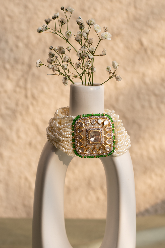 This stunning piece of jewelry is a perfect blend of elegance and versatility. It features a rectangular centerpiece adorned with smaller moissanite polki & cubic zirconia, set in a golden frame. The centerpiece is complemented by multiple strings of white pearls that add a touch of luster and charm. The design is minimal yet timeless, making it suitable for dressing up or down for any occasion. Whether it is a wedding or a festive get together, this accessory will enhance your look with its exquisite craftsmanship and beauty.