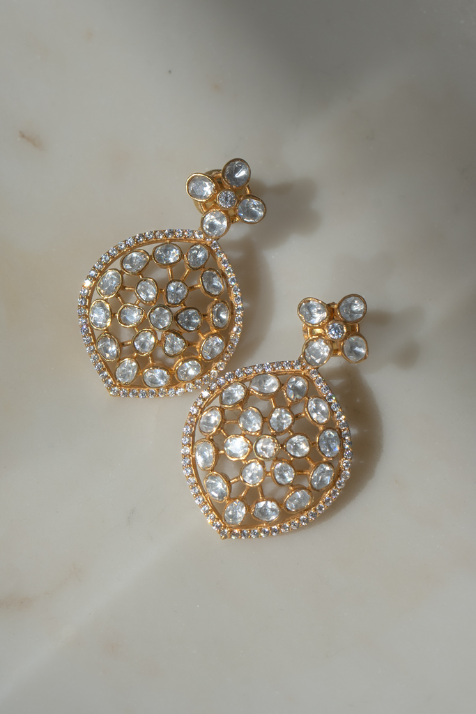 Sparkling moissanite polki stones are nestled at the center of each earring, adding a touch of luxury and sparkle. Perfect for everyday wear or special occasions, these earrings are sure to become a cherished part of your collection.