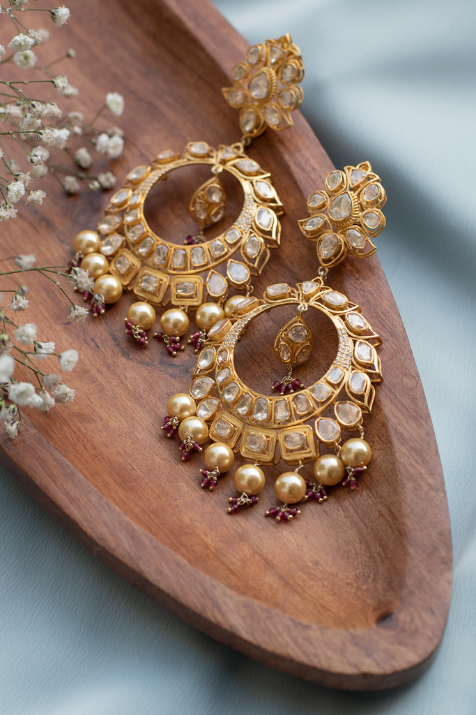Dazzle with these captivating Chandbali earrings, handcrafted from gleaming 925 silver. Intricate filigree work dances across the surface, showcasing the brilliance of sparkling moissanite polki gemstones. Delicate pearls cascade down the length, adding a touch of elegance and movement. These exquisite earrings, whispering tales of heritage, elevate any ensemble, making a statement that transcends time.