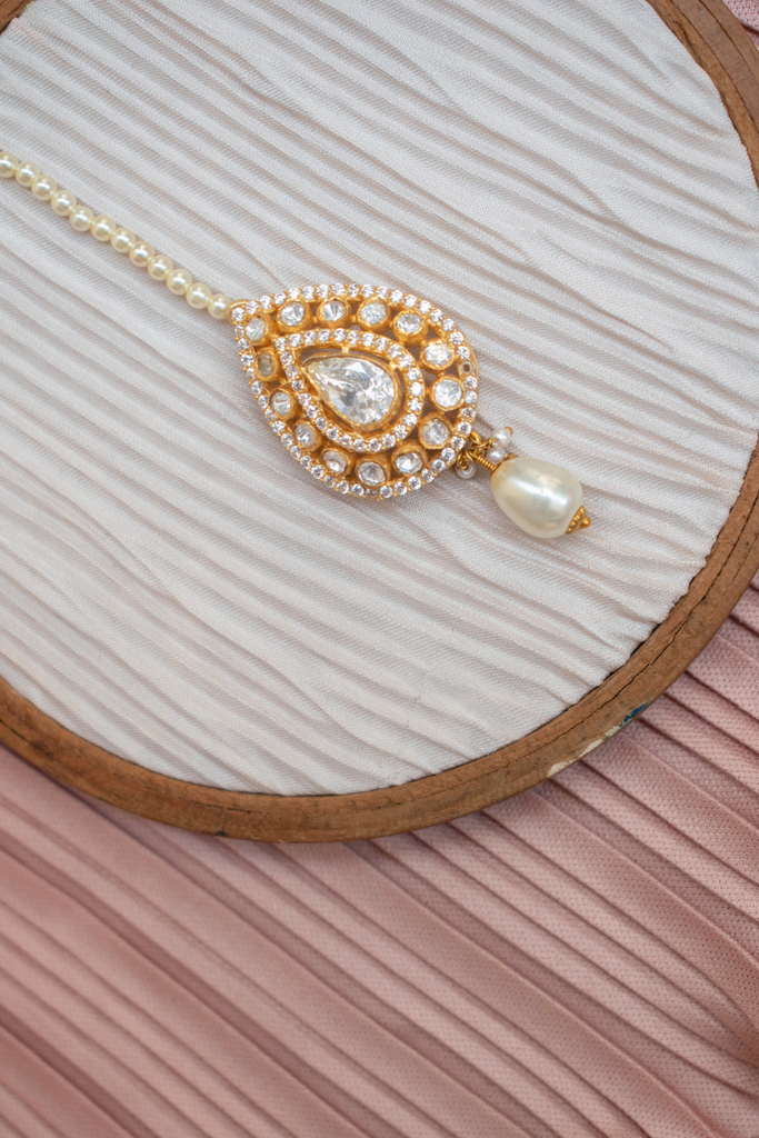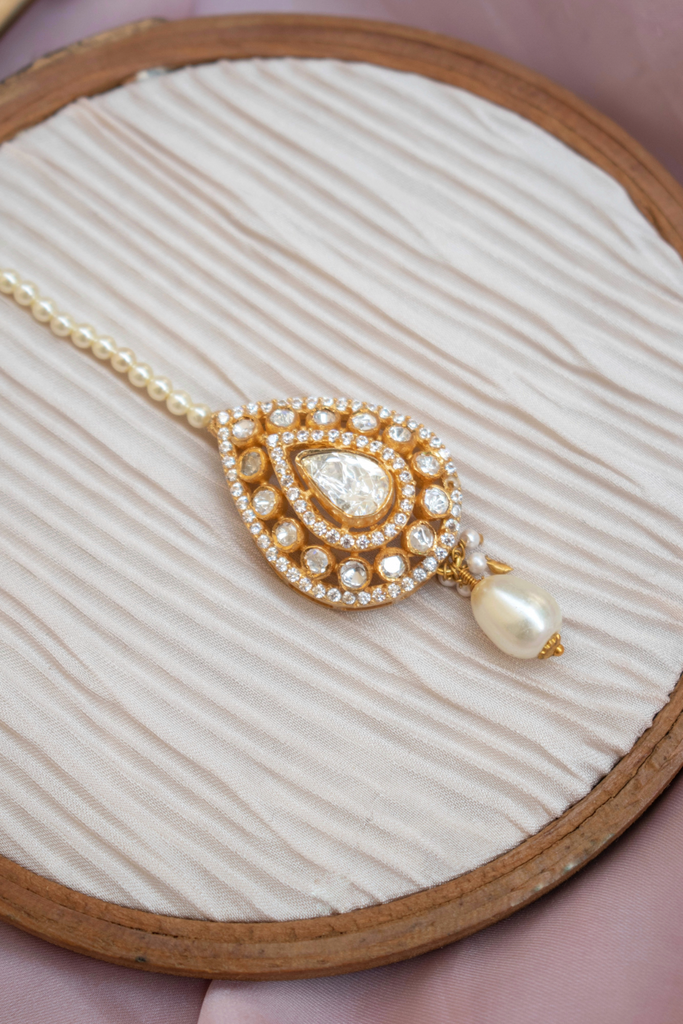A minimalist maang tikka featuring a captivating teardrop-shaped center stone adorned with shimmering polki stones. A delicate pearl drop adds a touch of elegance to this exquisite piece, perfect for completing any traditional look.