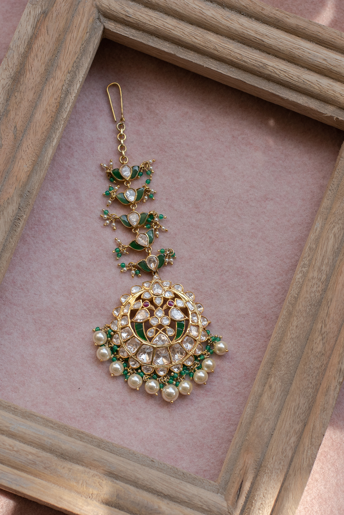 Embrace the spirit of love with this Maang Tikka, crafted from gleaming 925 silver bathed in a warm 22 karat gold plating. Inspired by the vibrant colors of Kamadeva's parrot mount, this exquisite piece features polki stones that shimmer with the passion of a thousand hearts. Delicate silverwork branches out, adorned with smaller moissanite polki stones and shimmering pearls, echoing the graceful flight of the parrot against a celestial backdrop. Hints of emerald green highlight the design, adding a touch of nature's vibrancy. This maangtikka embodies the elegance of love's embrace and the playful spirit of the parrot, symbolizing a timeless tradition waiting to adorn your ensemble.