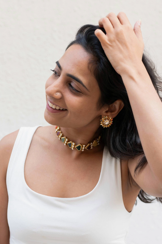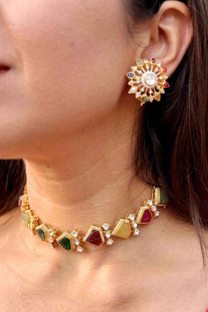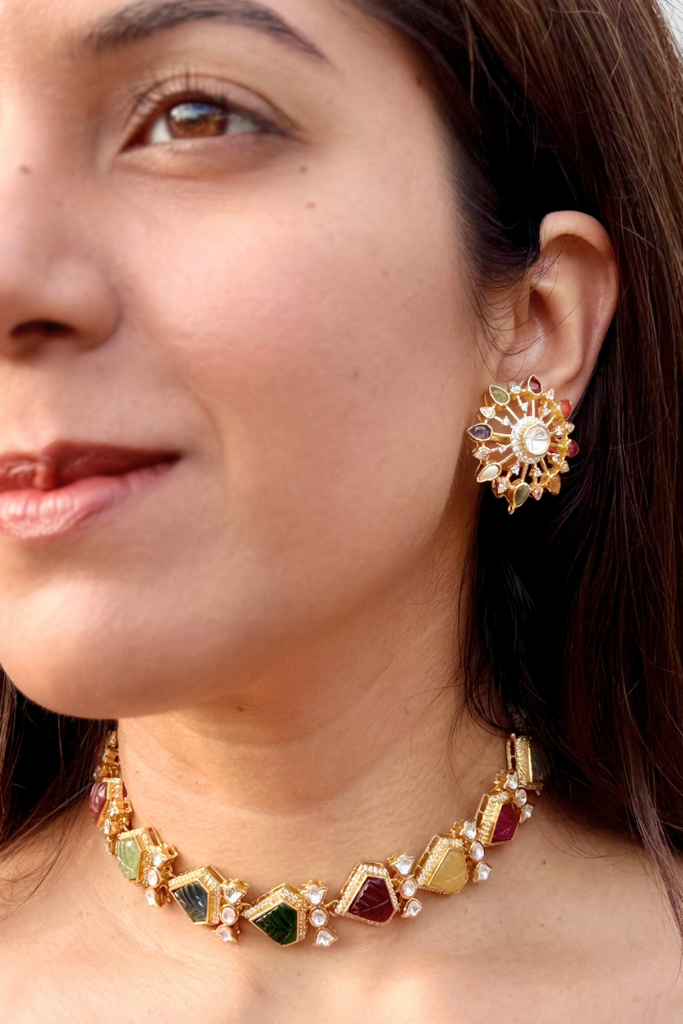 This exquisite Navratna choker reimagines traditional design with the inclusion of uncut moissanite polki. It features exquisite gemstones which have been hand-carved to perfection and inlayed in a beautiful setting of moissanite polki. The earrings further enhance the beauty of this choker by accentuating the colors of the choker to create a seamless symphony. The name for this piece been derived from Goddess Durga who is associated with the number 9 and is considered a powerful representation divine feminine energy.