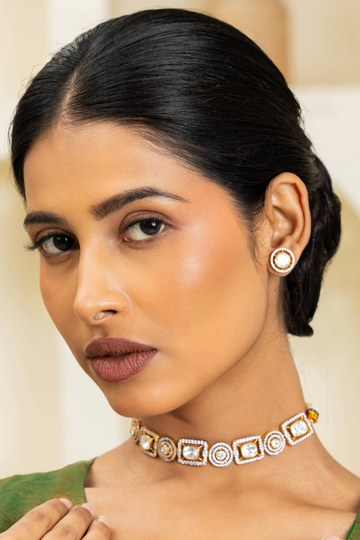 Adorn your décolletage with this exquisite choker necklace, a masterpiece of intricate design and radiant sparkle. Crafted from premium 925 silver, this piece features a lavish gold plating that exudes a warm, opulent glow. The necklace is meticulously embellished with brilliant moissanite polki stones, each one carefully set within charming square motifs that alternate with delicate pave-set accents. This stunning combination creates a harmonious blend of classic elegance and contemporary sophistication. The choker is paired with minimal studs to further enhance it's beauty. This piece promises to be a cherished addition to any jewellery collection, ensuring you radiate brilliance at every occasion.