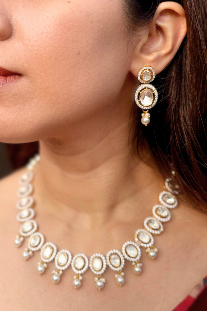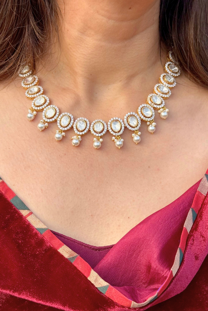 Moonlit Dew Polki and Pearl Necklace