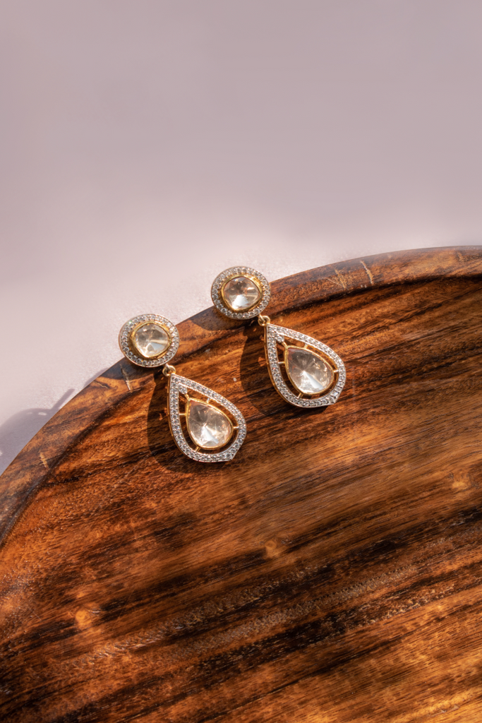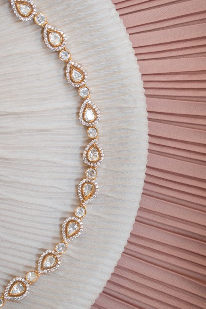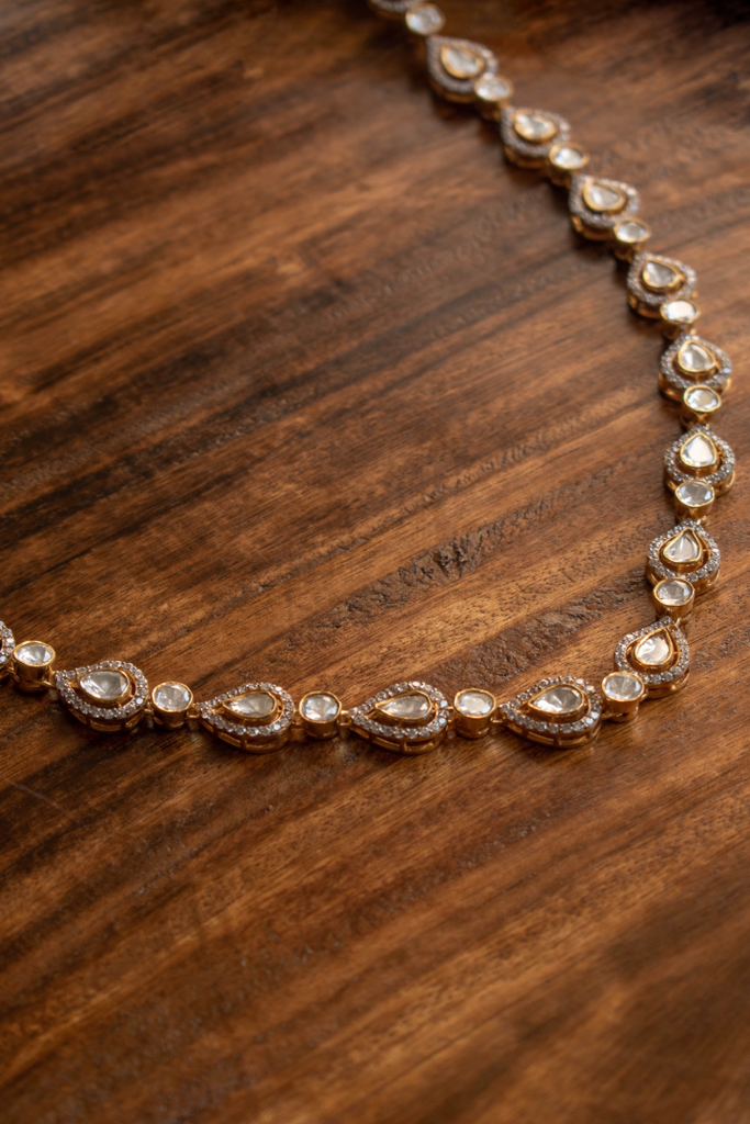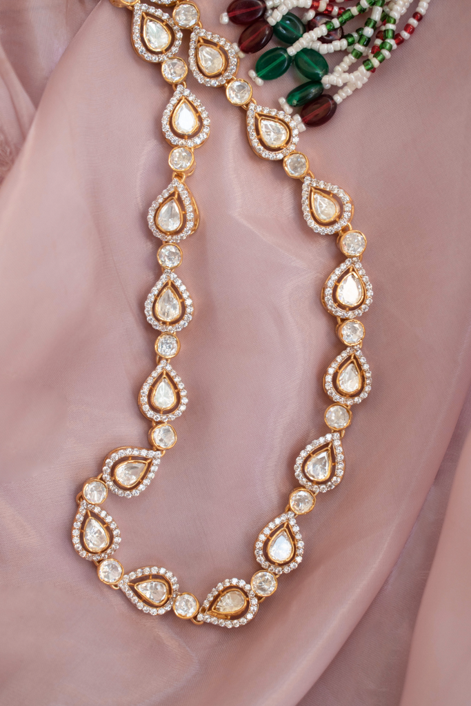 A captivating necklace inspired by the beauty of raindrops, featuring shimmering moisssnite polki stones. Crafted in silver with gold plating, this exquisite piece offers a delicate and elegant design. The intricate detailing and sparkling gems make it a perfect addition to any occasion.