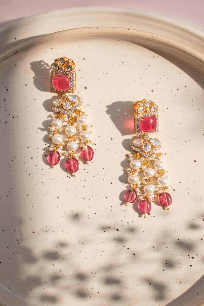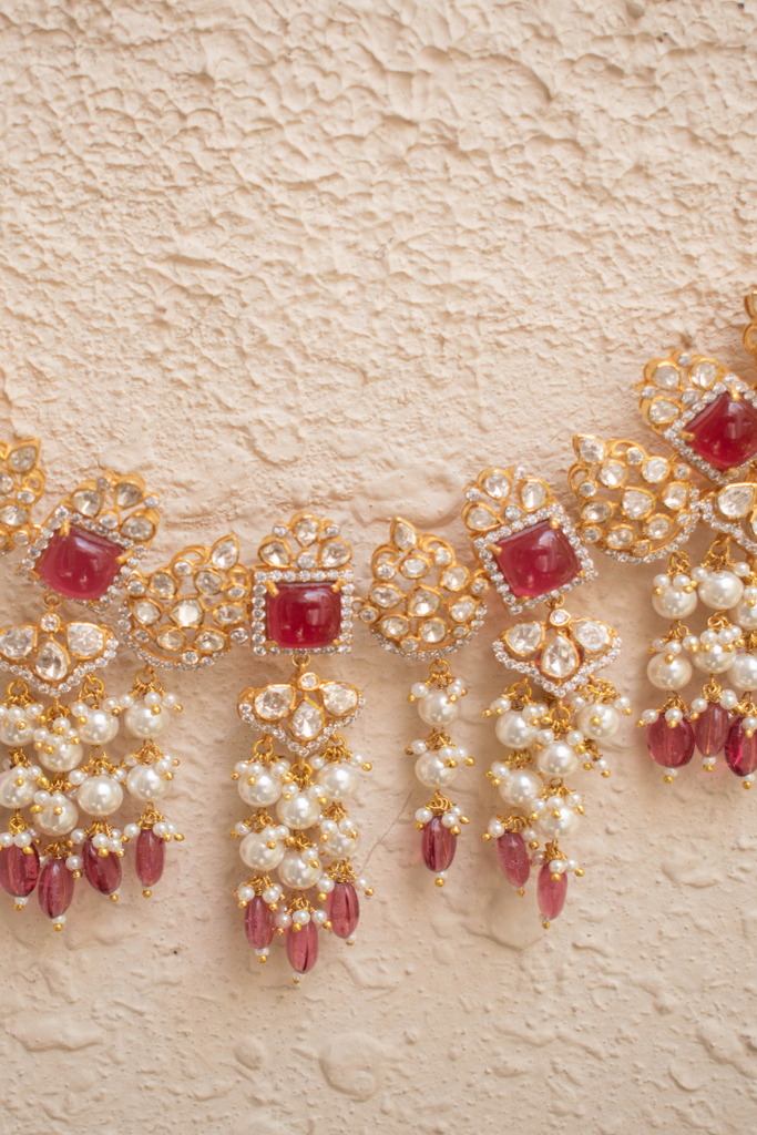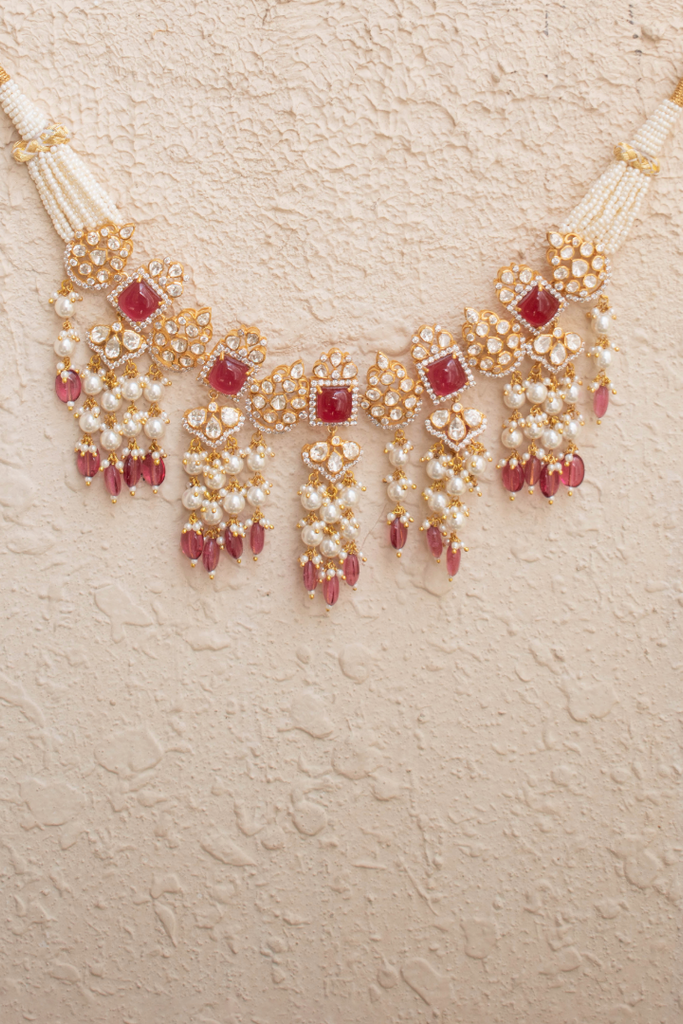 This exquisite necklace set, adorned with shimmering polki stones and vibrant rubies, exudes timeless elegance. The intricate design and delicate pearls create a captivating piece that adds a touch of royalty to any ensemble. "Ratnavali" is a fitting name, symbolizing the abundance and beauty of the gems adorning this stunning necklace.