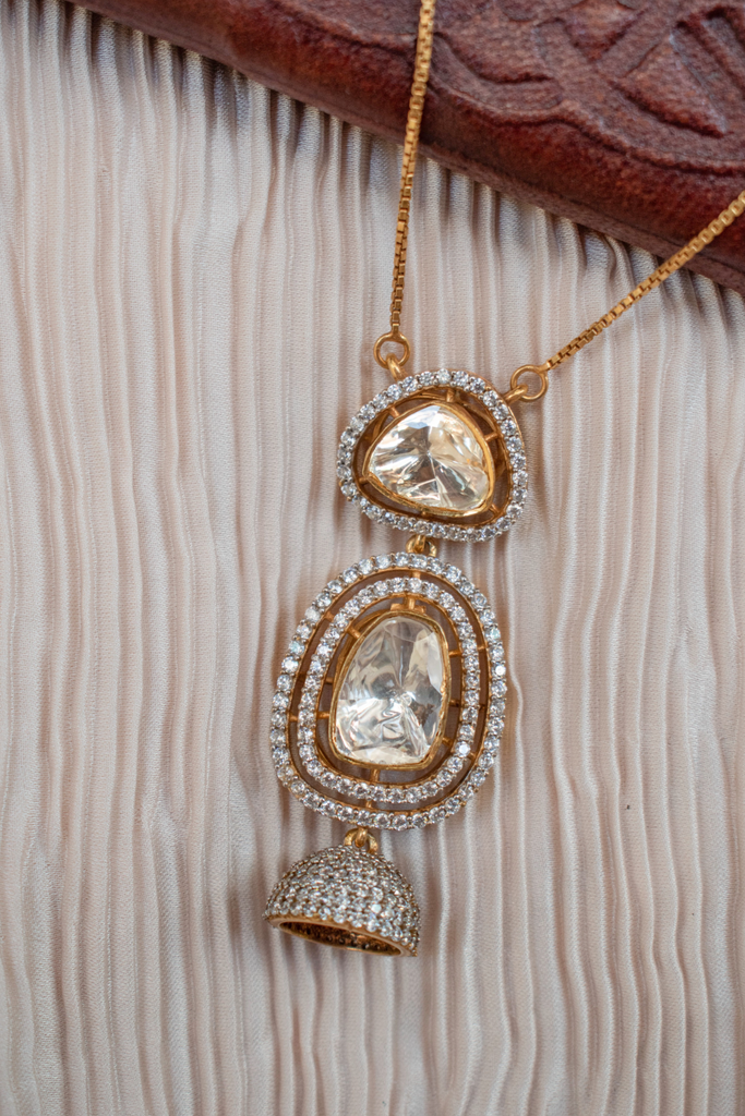 A captivating statement necklace featuring a three-part design adorned with shimmering polki stones. The intricate detailing and sparkling gems create a luxurious and elegant piece that adds a touch of glamour to any outfit.