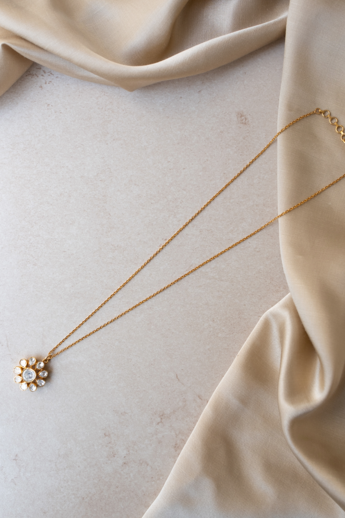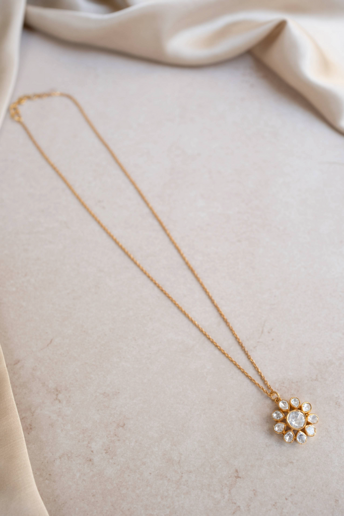 This delicate pendant, suspended on a fine gold-plated 925 silver chain, features a captivating floral design. A central, brilliant Moissanite Polki stone is encircled by a ring of smaller, uniquely shaped Polki stones, creating a luminous bloom. The warm gold plating enhances the sparkle of the Moissanite, offering a touch of classic elegance. This pendant is perfect for adding a subtle yet sophisticated sparkle to any neckline making it a versatile piece for everyday wear.