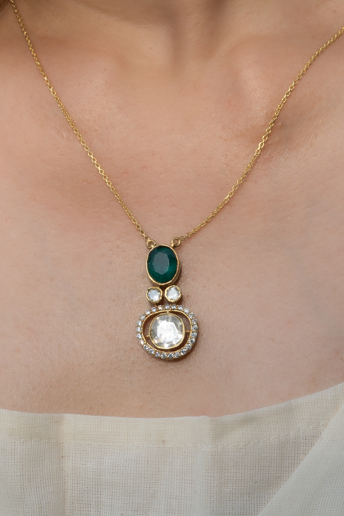 A captivating fusion of modern and vintage, this necklace transcends the ordinary. Silver, plated in gleaming gold, forms a delicate chain that suspends a truly unique centerpiece.The centre piece and the petite moissanite polki stones and their icy fire is juxtaposed with the captivating allure of a single green gemstone, reminiscent of emeralds. This pairing creates a conversation piece, a unique dance between modern luxury and timeless elegance.The green gemstone injects a pop of color, a touch of classic sophistication that complements the moissanite's modern edge. This interplay of light and color makes the necklace a versatile treasure.