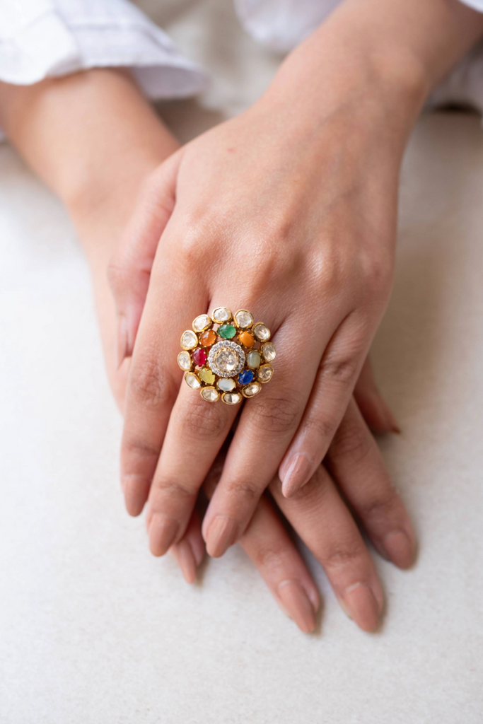 This vibrant ring, crafted from gold-plated 925 silver, features a central Moissanite Polki stone surrounded by a halo of smaller zirconia stones. A ring of Navrattan stones adds a kaleidoscope of color. This ring combines traditional Navrattan symbolism with modern sparkle, creating a unique and eye-catching piece.
