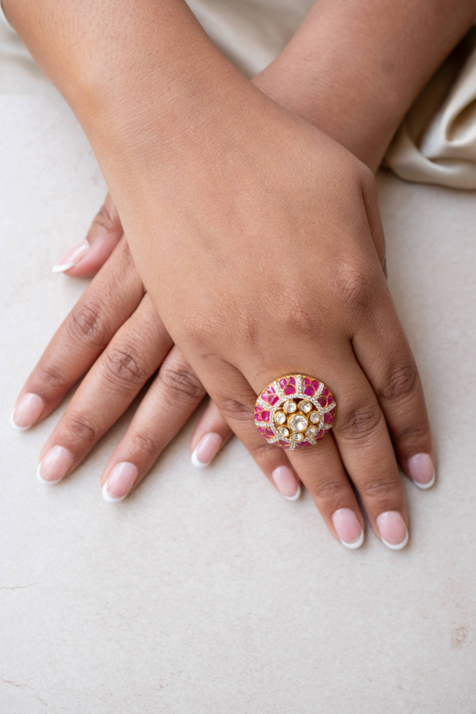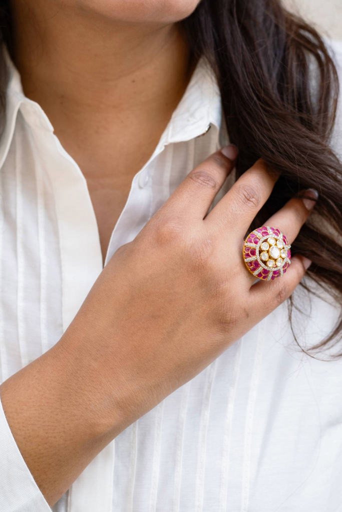 This captivating ring, crafted from 925 silver with a luxurious gold plating, boasts a striking circular design. At its heart, a cluster of Moissanite Polki stones sparkles brilliantly, encircled by a halo of smaller, pavé-set stones. Adding a touch of vibrant colour are the rich ruby hues of the surrounding stones, creating a visually stunning contrast. For a touch of undeniable elegance and glamour, this statement ring is the perfect finishing touch for any event.