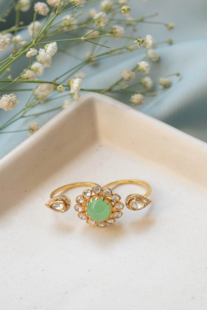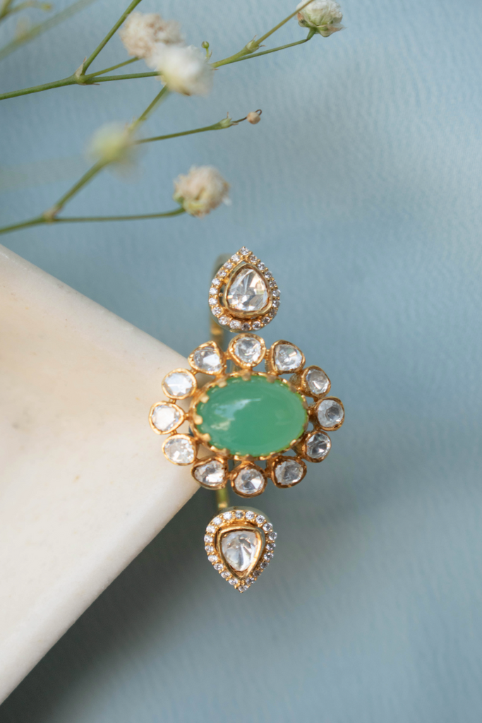 This exquisite moissanite polki ring, crafted in silver with gold plating, is a testament to understated elegance. The intricate design, reminiscent of traditional Indian jewelry, features a cluster of sparkling moissanite stones. The unique silhouette and delicate details make this ring a standout piece that effortlessly complements any outfit.