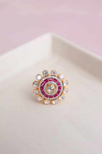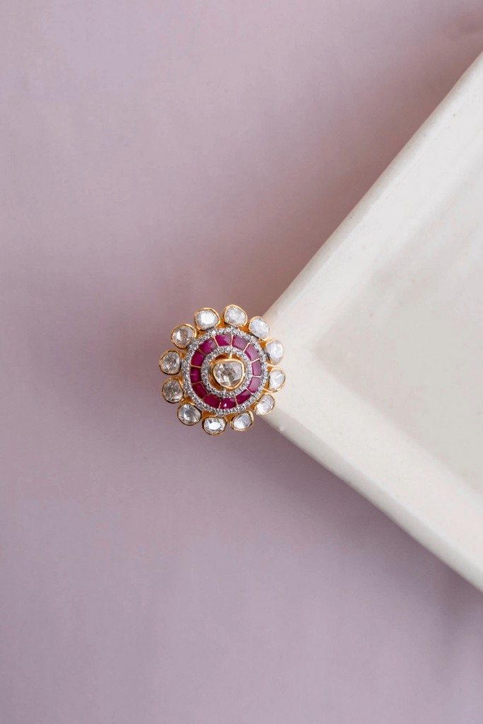 This captivating ring features a silver base, expertly overlaid with a rich gold plating, radiating a warm, luxurious glow. At its heart lies a central moissanite polki stone, surrounded by a halo of smaller, similarly cut stones, creating a dazzling focal point. The ring's design is further enhanced by a vibrant ring of ruby hued gemstones, adding a touch of color and depth. The combination of the textured polki cuts, the lustrous gold, and the serene green hues creates a harmonious blend of traditional and contemporary aesthetics, making it a truly eye-catching piece.