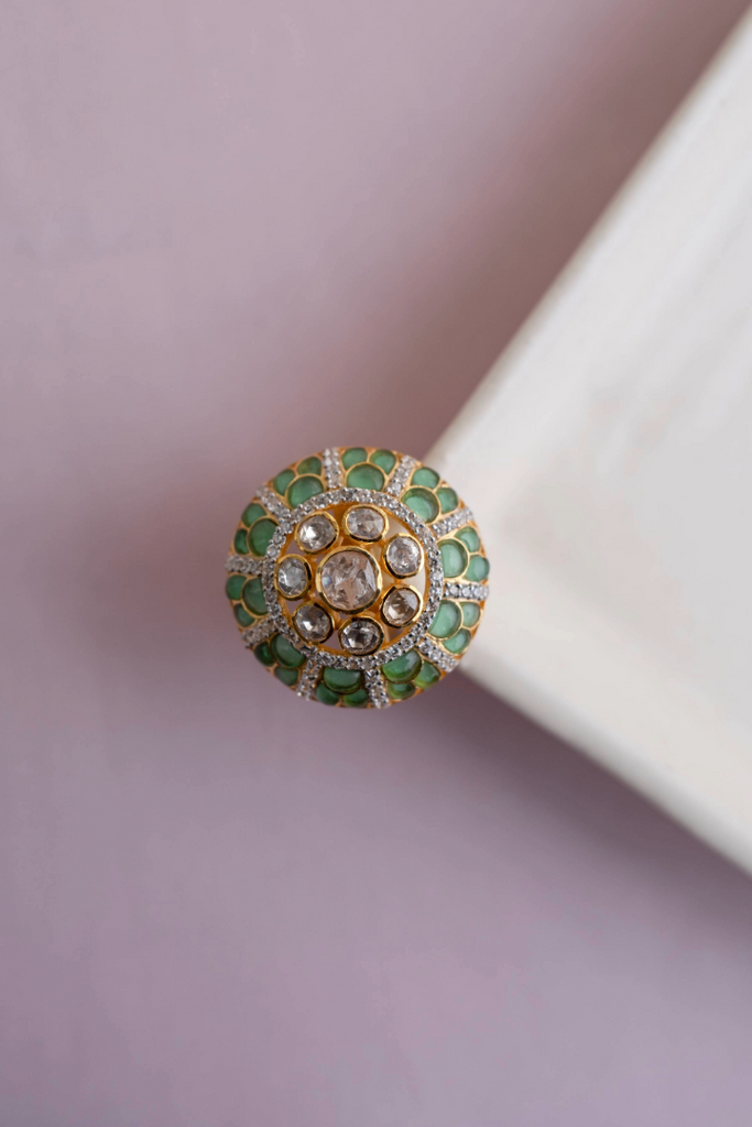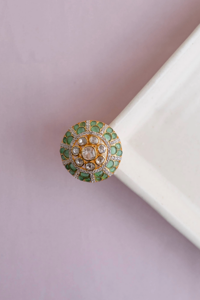 This ring features a radiant 925 silver base, elegantly plated with warm gold. The design is centered around a captivating arrangement of moissanite polki stones, their brilliance enhanced by the surrounding light green gemstones. These stones create a delicate interplay of light and color, adding a touch of sophistication. The ring seamlessly blends traditional stone embellishments with a modern aesthetic, making it a versatile piece for any occasion.
