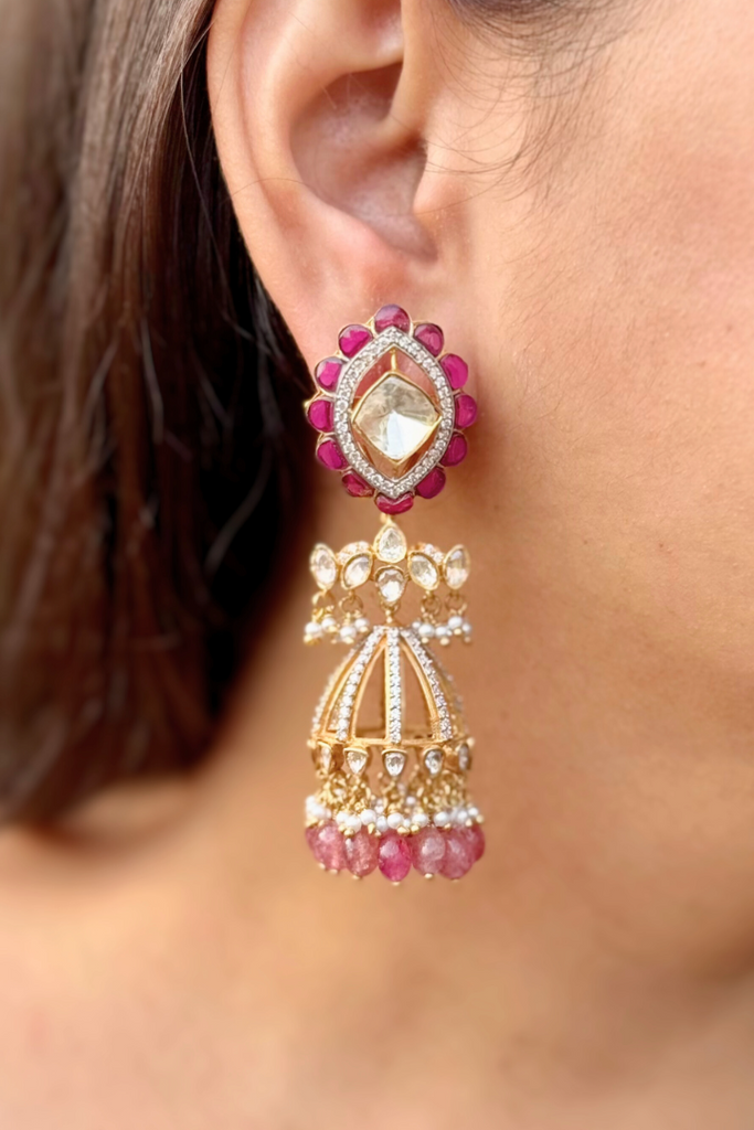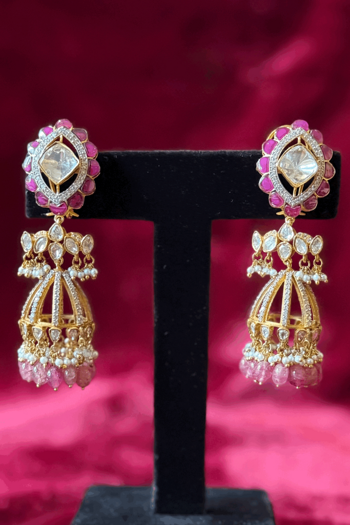 These striking chandelier earrings showcase a captivating blend of traditional and contemporary design. Each earring features a central polki stone, its charm enhanced by a shimmering halo of cubic zirconia. The top section is framed by vibrant gemstones, adding a pop of color. The lower portion cascades into a delicate chandelier design, with intricate gold detailing and dangling pearls. This combination of textures—the polki, the sparkling zirconia, the smooth pearls, and the colorful gemstones—creates a dynamic and eye-catching piece. The gold setting adds warmth and richness to the overall design.