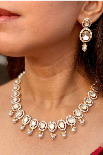 Moonlit Dew Polki and Pearl Necklace